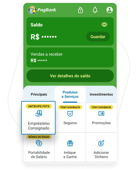 O Consignado PagBank está disponível para aposentados e pensionistas do INSS, servidores públicos ou pensionistas de órgãos municipais, estaduais e federais, militares ou pensionistas das Forças Armadas, desde que haja convênio entre o órgão público/fonte pagadora com o PagBank. O valor máximo da sua parcela (margem consignável) mensal é definido conforme o convênio estipulado entre o PagBank e a fonte pagadora em que você está enquadrado. O débito da parcela é efetuado mensalmente pelo órgão público/fonte pagadora em folha de pagamento/benefício. Sujeito à análise cadastral e condições do produto. O PagSeguro Internet Instituição de Pagamento S/A não é uma instituição financeira, não realiza operações de crédito diretamente e atua como correspondente bancário de instituições financeiras parceiras. A concessão de crédito é de responsabilidade dessas instituições, dentre elas o Banco Seguro S.A. As taxas podem variar de acordo com a categoria, valor e quantidade de parcelas. As condições de pagamento serão apresentadas no momento da contratação. Consulte condições do produto em: https://pagbankconsignados.com.br. Central de Atendimento: 4003-1775 (Capitais e região metropolitana) ou 0800 728 21 74 (demais localidades, exceto celular).
